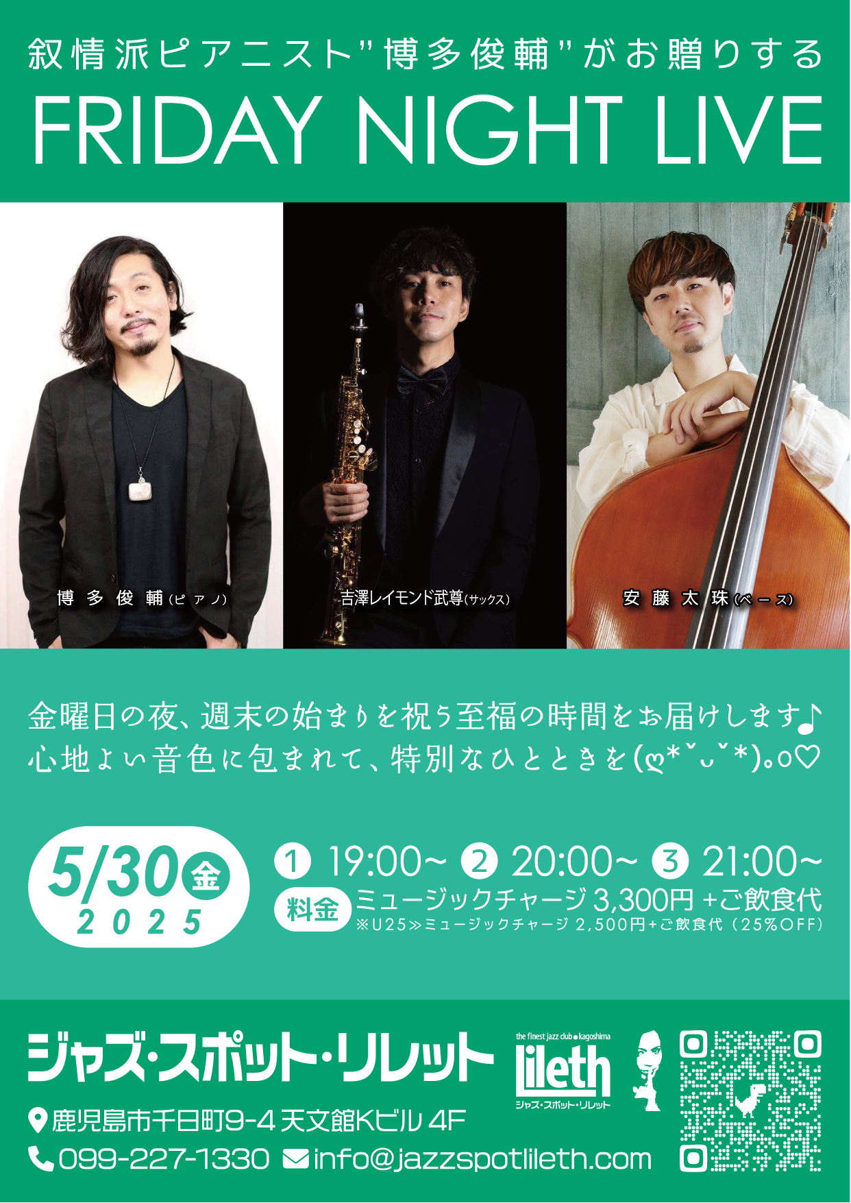 - 【U25(25歳以下)】ミュージックチャージ 2,500円 +ご飲食代(25%OFF)