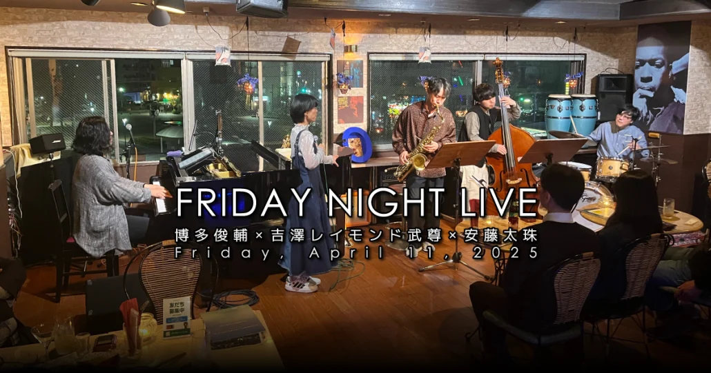 博多俊輔×吉澤レイモンド武尊×安藤太珠 on Friday Night Live 250411 2025年4月11日 jazzspotlileth ライブレポート 0 Tweet bassjazzlivepianoSaxサックスジャズピアノベースライブ博多俊輔吉澤レイモンド武尊天文館安藤太珠生演奏